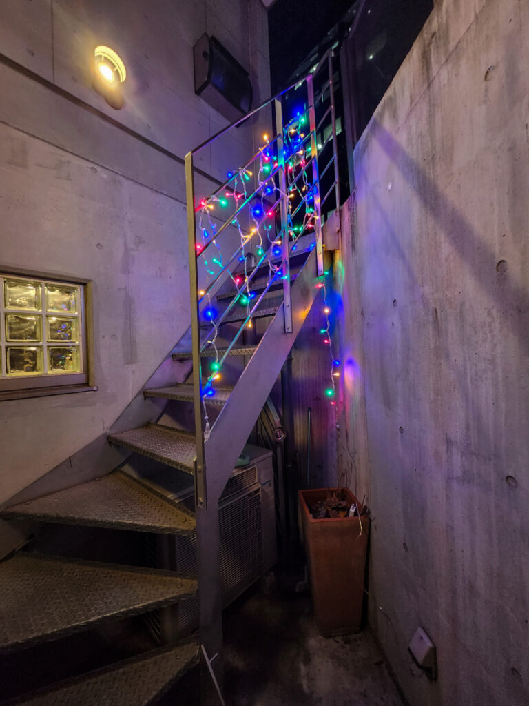 クリスマスシーズンということもあり、ワークショップのタイミングに合わせてスタジオの入り口階段にイルミネーションを取り付けました。これも好評でした。